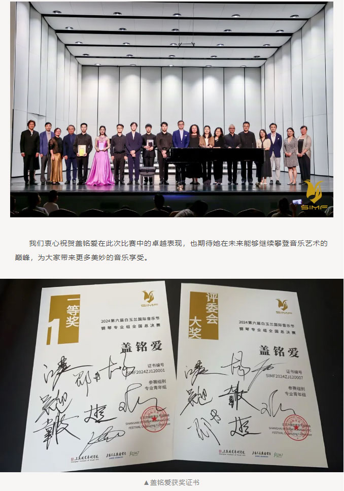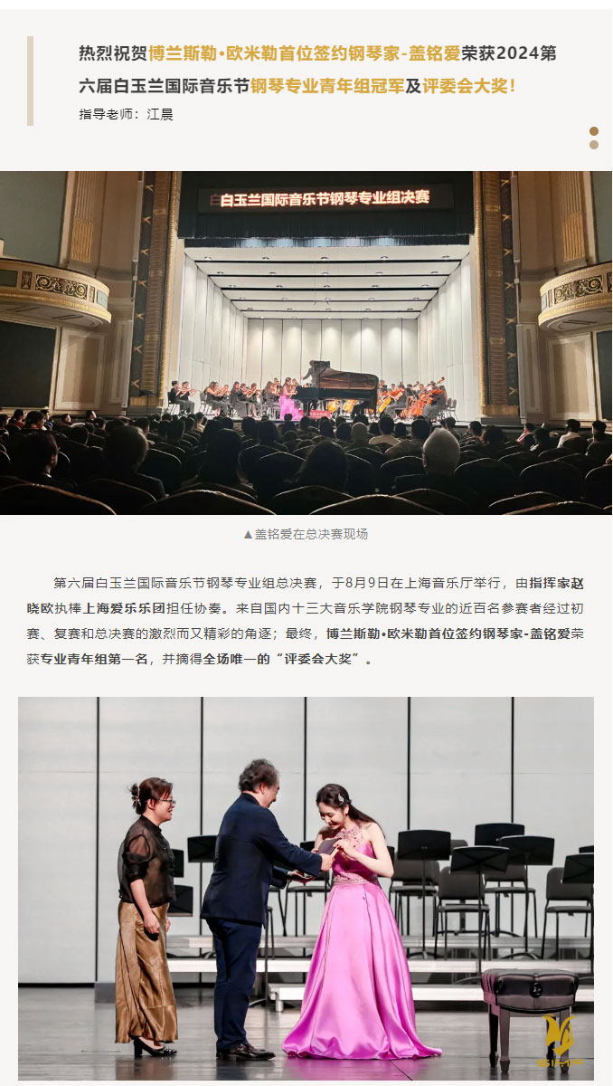 白玉蘭冠軍|祝賀歐米勒首位簽約鋼琴家-蓋銘愛(ài)榮獲2024第六屆白玉蘭國(guó)際音樂(lè)節(jié)鋼琴專業(yè)組總決賽冠軍!