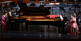 此次的雙鋼琴與交響樂(lè)隊(duì)合作,規(guī)模之大,曲目之多,這在大連尚不多見(jiàn)。兩位鋼琴家演奏的莫扎特的《降E大調(diào)雙鋼琴協(xié)奏曲》,德彪西的雙鋼琴《小組曲》及中國(guó)作曲家崔世光的雙鋼琴協(xié)奏曲《喜慶中國(guó)》等,都給觀眾帶來(lái)了耳目一新的感覺(jué)。