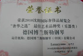 此次奢侈品展還通過眾多客戶的投票產生獎項,德國國寶-博 蘭斯勒鋼琴榮獲2010年沈陽國際奢侈品展最佳奢華藝術品牌獎, 而榮登了“最佳奢華藝術”的寶座。此次獲獎無疑是對德國國寶— 博蘭斯勒鋼琴引領了整個國際奢華藝術的肯定,博蘭斯勒不僅引領 樂器界的奢華藝術,更為它在2010年國際奢侈品引領的道路上開 辟了一條更光明的路…
