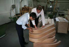 接著,在總裁的陪同下參觀了博蘭斯勒工廠,首先大師經(jīng)過 的是木材加工制作間。從木材的存放到干燥、穩(wěn)定處理再到成形; 最后形成我們博蘭斯勒獨一無二的背架、音板及外殼。博蘭斯勒共 鳴弦專利系統(tǒng)、獨立掛弦等精湛的技術(shù)令大師豎起了大拇指,并放 心的將屬于自己獨一無二的鋼琴交給博蘭斯勒去制作。