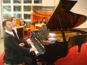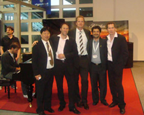 春天是萬(wàn)物復(fù)蘇的季節(jié),廣州的4月更是早已遍地鮮花,一些樹(shù) 也長(zhǎng)出了它“新的年輪”。在地球另一端的德國(guó),一年一度的國(guó)際 法蘭克福樂(lè)器展正在如火如荼的舉行著,德國(guó)鋼琴制造業(yè)協(xié)會(huì)( BVK)主席、德國(guó)博蘭斯勒鋼琴總裁博思進(jìn)(Dr.Christian Blüthner)博士、博蘭斯勒(中國(guó))總經(jīng)理方陽(yáng)先生、以及歐米 勒孖寶再次盛裝出席法蘭克福樂(lè)器展。歐米勒孖寶受邀在展會(huì)表演 區(qū)以他們獨(dú)具特色的演繹為09年這樣一個(gè)特殊環(huán)境下的展會(huì)帶來(lái) 了激動(dòng)人心的活力與激情。