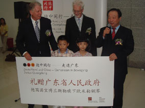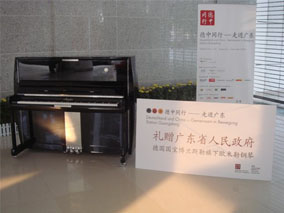金秋11月,隨著"德中同行--走進(jìn)廣東"活動(dòng)的深入開展,作 為"德中同行"活動(dòng)的重要組成部分,為期九天的"德國(guó)大道"活動(dòng)在 廣州市天河體育中心西門廣場(chǎng)拉開了帷幕,并將持續(xù)至11月15日 。德國(guó)駐華大使、德國(guó)聯(lián)邦經(jīng)濟(jì)部國(guó)務(wù)秘書伯恩特·普法芬巴赫博 士、廣東省副省長(zhǎng)宋海、德國(guó)外交部對(duì)華工作小組主任"德中同 行"特使芮悟峰博士、德國(guó)駐廣州總領(lǐng)事舒涵德先生、德國(guó)博蘭斯 勒鋼琴(中國(guó))公司總經(jīng)理方陽等德國(guó)著名企業(yè)代表就出席了開幕式 。在開幕式上,德國(guó)國(guó)寶博蘭斯勒鋼琴旗下的德國(guó)歐米勒阿麗莎鋼 琴被德國(guó)政府選為國(guó)禮,歐米勒鋼琴被作為德中同行的象征,由德 國(guó)政府贈(zèng)送給廣東省政府。德國(guó)駐華大使施明賢博士代表德國(guó)政府 向廣東省政府宋海副省長(zhǎng)贈(zèng)送了這一珍貴禮物。在贈(zèng)送儀式上特別 邀請(qǐng)了一對(duì)6歲的雙胞胎姐弟為現(xiàn)場(chǎng)嘉賓演奏鋼琴四手聯(lián)彈-友誼地 久天長(zhǎng),此時(shí)全場(chǎng)歡聲雷動(dòng)。