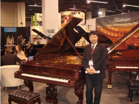 在美國(guó)2008 年1月17日,一年一度的全球樂(lè)器制作界盛會(huì) —2008 NAMM SHOW,在美國(guó)南加利福尼亞洲的阿納海姆會(huì)議 中心隆重開(kāi)幕。阿納海姆會(huì)議中心是西海岸最大的會(huì)議中心同時(shí)也 是世界最大的會(huì)議中心之一。展館共有5個(gè),共有813,607平方英 尺,可同時(shí)容納、接待103150人,展館總共可安排2890個(gè)展位 。全球樂(lè)器廠商及世界各國(guó)經(jīng)銷(xiāo)商云集于此,展示發(fā)布最新的產(chǎn)品 及行業(yè)信息。NAMM SHOW不但是音樂(lè)制作工業(yè)展示其各種新品 樂(lè)器的舞臺(tái),而且還提供給全球各個(gè)經(jīng)銷(xiāo)商和制作商交流和成功發(fā) 展的平臺(tái),同時(shí)也是全球音樂(lè)人的一次盛大聚會(huì)。會(huì)場(chǎng)內(nèi),人流涌 動(dòng),各大廠商均在NAMM SHOW上同期全球發(fā)布其最新、最熱門(mén) 以及最具前瞻性、革命性的產(chǎn)品。德國(guó)博蘭斯勒鋼琴公司及博蘭斯 勒(中國(guó))總經(jīng)理方陽(yáng)作為其VIP會(huì)員受邀前往參加展會(huì)。博蘭斯 勒全球首發(fā)又一155周年紀(jì)念版鋼琴- 凱撒大帝驚爆NAMM SHOW。凱撒大帝全琴使用極其名貴木材經(jīng)過(guò)2年的精心打造成為 整個(gè)展會(huì)的亮點(diǎn)。凱撒大帝一經(jīng)展出就被美國(guó)一位不愿透露姓名的 巨富以139.99萬(wàn)美金購(gòu)得珍藏。