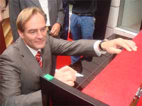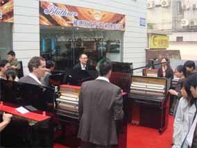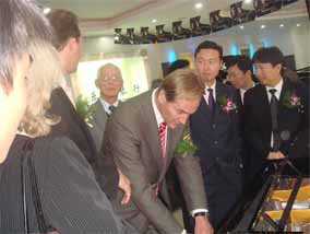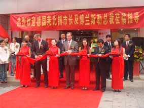2007年10月25日,在南京樂博琴行德國博蘭斯勒鋼琴展廳 門口懸掛著中德兩國的國旗,門前張燈結(jié)彩。早上十點(diǎn)鐘,德國博 蘭斯勒鋼琴的出產(chǎn)地-萊比錫市長(zhǎng)榮格先生(MR.BURGHARD JUNG)以及德國萊比錫政府代表團(tuán)及德國媒體的代表出席德中同 行-德國博蘭斯勒鋼琴展(10月25日-11月8日)的剪彩儀式,德 國萊比錫市長(zhǎng)榮格先生,博蘭斯勒總裁博思進(jìn)先生,南京樂博有限 公司總經(jīng)理姚廣生先生為為期兩個(gè)星期的德國博蘭斯勒鋼琴展剪彩 。剪彩儀式結(jié)束后,在博蘭斯勒總裁博思進(jìn)博士及博蘭斯勒鋼琴中 國公司總經(jīng)理方陽先生的陪同下,德國萊比錫市長(zhǎng),萊比錫前任市 長(zhǎng)及來賓們參觀了博蘭斯勒鋼琴展。博蘭斯勒旗下的歐米勒形象代 言人歐米勒孖寶為遠(yuǎn)道而來的貴賓再次表演絕技。在大家的邀請(qǐng)下 ,博蘭斯勒總裁博思進(jìn)博士也為在場(chǎng)的貴賓獻(xiàn)上一首世界名曲。博 蘭斯勒黃金般的音色令德國萊比錫市長(zhǎng)榮格先生以及前市長(zhǎng)躍躍欲 試。參觀完鋼琴展,正當(dāng)萊比錫市長(zhǎng)榮格先生要離開時(shí),前來購琴 的觀眾紛紛邀請(qǐng)市長(zhǎng)在其購買的歐米勒鋼琴上簽名以作留念。博蘭 斯勒鋼琴展開展后,博蘭斯勒總裁博思進(jìn)博士以及博蘭斯勒旗下的 歐米勒形象代言人歐米勒孖寶親臨現(xiàn)場(chǎng)簽售鋼琴。就在開展的第一 天,江蘇樂博漢中店銷售的鋼琴近20臺(tái)博蘭斯勒旗下歐米勒鋼琴。