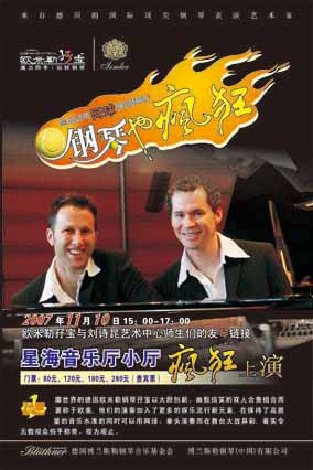 德國著名鋼琴藝術(shù)家、當(dāng)今世界鋼琴界的當(dāng)紅明星——?dú)W米勒 孖寶即將“駕臨”廣州。11月10日,歐米勒孖寶“鋼琴也瘋狂 ”——?dú)W米勒孖寶與劉詩昆藝術(shù)中心師生們友“琴”鏈接音樂會將 在星海音樂廳舉行。作為世界鋼琴界當(dāng)前最炙手可熱的人物,歐米 勒孖寶擅長以非傳統(tǒng)的方式進(jìn)行鋼琴演奏,網(wǎng)球、拳頭、肘甚至臀 部都是他們演奏的工具,他們的魅力早已席卷歐美。這次廣州巡演 ,主辦方特邀劉詩昆藝術(shù)中心的師生們與歐米勒孖寶進(jìn)行一場音樂 聯(lián)歡,屆時,不僅有鋼琴表演,還有舞蹈、小提琴、模特秀等精彩 演出。毫無疑問,這將是一場令人期待的音樂狂歡秀。