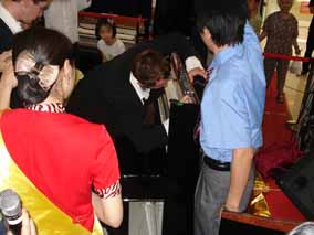 表演現(xiàn)場(chǎng)“歐米勒孖寶”還為購(gòu)買(mǎi)“德國(guó)歐米勒”鋼琴的十幾 位買(mǎi)家設(shè)立了一個(gè)特殊簽售歐米勒鋼琴環(huán)節(jié),“歐米勒孖寶”雙雙 在每一臺(tái)歐米勒鋼琴上留下各自的簽名。精彩的演出令在場(chǎng)觀眾尤 為留戀,他們極力拍手、瘋狂呼喊“孖寶、孖寶”。當(dāng)“歐米勒孖 寶”重返舞臺(tái)時(shí),用他們的拿手好戲——用網(wǎng)球彈奏鋼琴來(lái)回報(bào)現(xiàn) 場(chǎng)觀眾的厚愛(ài),精彩絕倫的表演再次吸引了現(xiàn)場(chǎng)眾,他們紛紛涌到 臺(tái)前,瘋了!瘋了?。∮织偭耍。?!