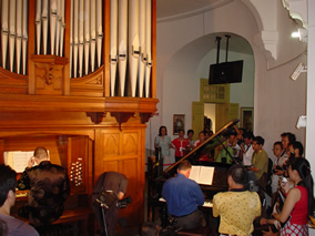 ?。常比胀黹_幕式音樂會上,來自澳大利亞的兩位著名音樂家——鋼琴家杰弗利·托薩和管風(fēng)琴演奏家瑞思·博克,聯(lián)袂演奏由法國浪漫派作曲家法蘭克和英國作曲家彼得斯所作的兩首鋼琴與管風(fēng)琴合奏作品。合奏音樂會上使用的鋼琴是鼓浪嶼鋼琴博物館珍藏的1937年的博蘭斯勒(Blüthner)鋼琴,管風(fēng)琴與鋼琴合奏,這在國內(nèi)尚屬首次。