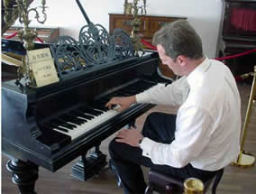 總裁一行受到了鼓浪嶼鋼琴博物館的熱情招待,在工作人員的陪同下參觀了博物館收藏的古鋼琴,隨后認(rèn)真欣賞研究了自己家族公司制造的那架產(chǎn)于1937年的博蘭斯勒九尺三角演奏鋼琴。經(jīng)歷過70年的風(fēng)風(fēng)雨雨,這架鋼琴不但外觀保養(yǎng)的很好,而且那黃金般的音色也依然堪稱完美。外在異國他鄉(xiāng)看見這架自己家族先人制造的比自己父親年齡還大的鋼琴,總裁顯得尤為興奮,認(rèn)真聽取導(dǎo)游講述這架鎮(zhèn)館寶琴的歷史與經(jīng)歷。在工作人員的邀請下,總裁即興彈奏了一段德國民間小調(diào),博得滿堂喝彩,既為總裁嫻熟流暢的彈奏技巧,更為這架有70年歷史博蘭斯勒古鋼琴的黃金般音色。