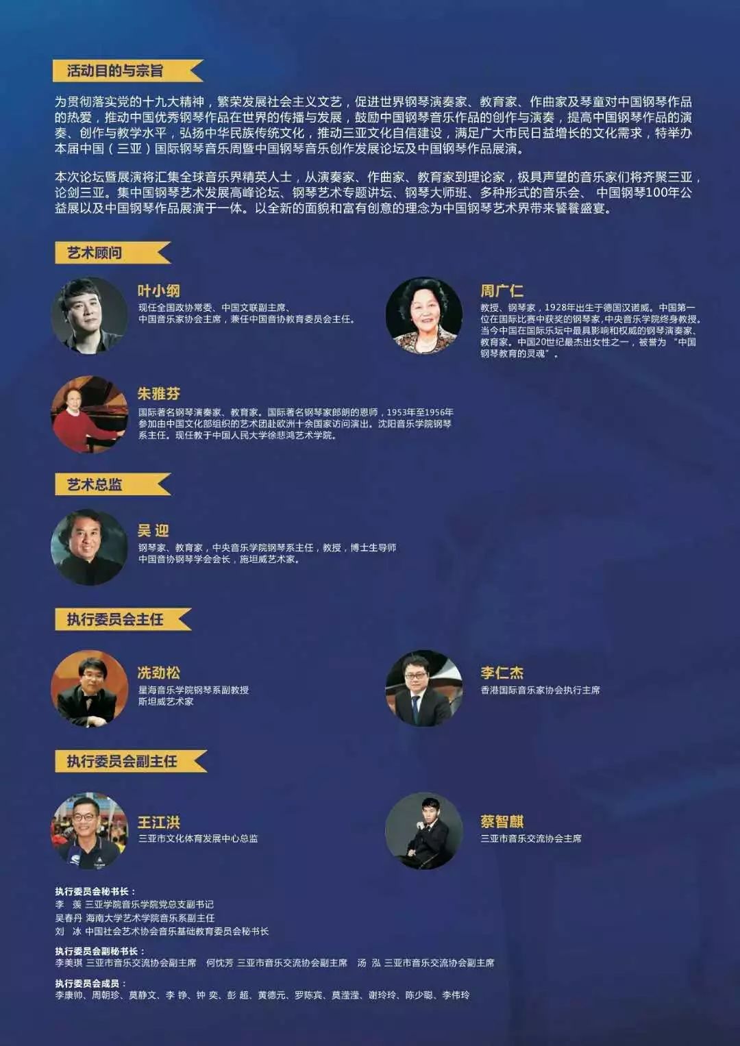 2018首屆中國(三亞)國際鋼琴音樂周,由現(xiàn)任全國政協(xié)常委、中國文聯(lián)副主席、中國音樂家協(xié)會主席,兼任中國音協(xié)教育委員會主任葉小綱;被譽為“中國鋼琴教育的靈魂”周廣仁與國際著名鋼琴演奏家、教育家朱雅芬擔(dān)任藝術(shù)顧問。中央音樂學(xué)院鋼琴系主任、中國音協(xié)鋼琴學(xué)會會長,著名鋼琴家吳迎擔(dān)任藝術(shù)總監(jiān)。本屆音樂周總共匯集了得到了中國音協(xié)鋼琴學(xué)會、中國11大音樂學(xué)院等25個專業(yè)團體支持,音樂周規(guī)??涨?,活動形式豐富多彩,集高峰論壇、專題講座、大師公開課、多種形式的音樂會以及中國鋼琴作品展演于一體,內(nèi)容豐富是目前全國兼具欣賞價值和學(xué)術(shù)高度的音樂活動之一。德國博蘭斯勒鋼琴中國區(qū)總裁方陽,德國博蘭斯勒鋼琴??趯I店總經(jīng)理黃德元,羅賓應(yīng)邀出席活動。
