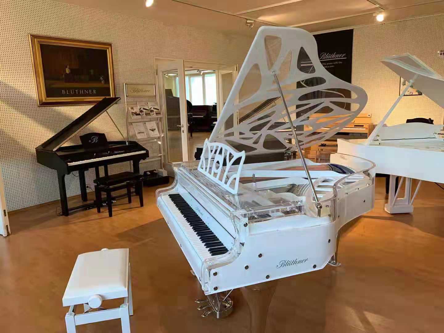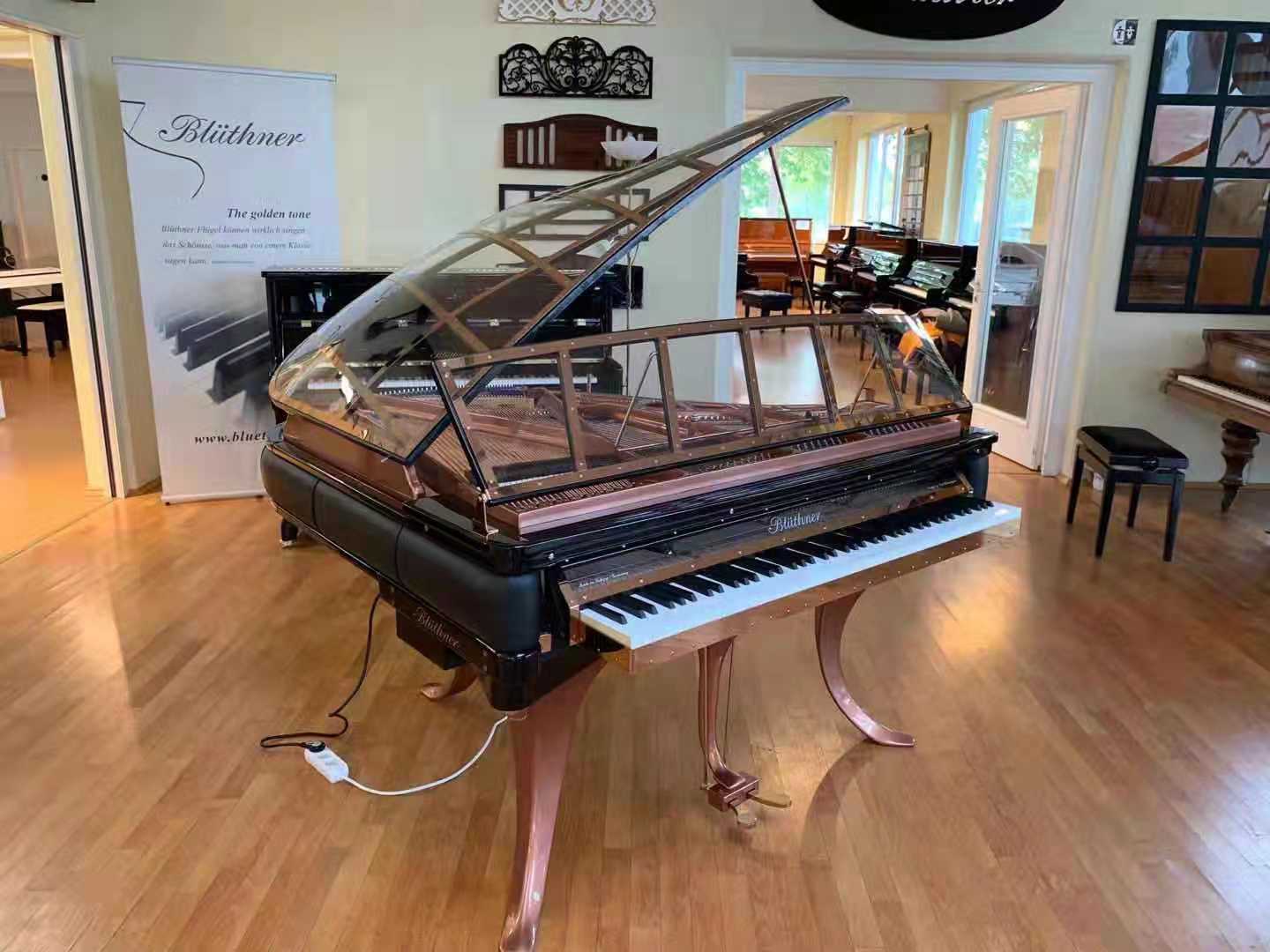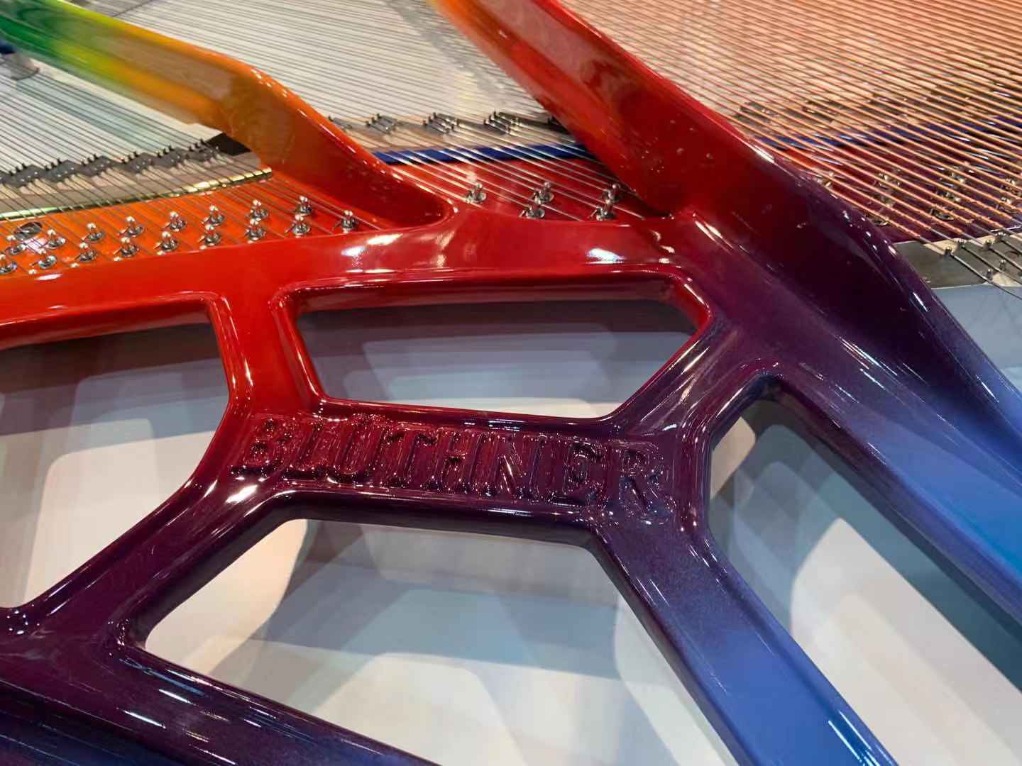 在現(xiàn)場(chǎng)眾多令人目不暇接的常規(guī)型號(hào)與定制型號(hào)中,最為奪人眼球的莫過(guò)于現(xiàn)場(chǎng)的一架博蘭斯勒水晶詩(shī)意定制系列——“彩虹之上”。區(qū)別于市面上其他的水晶鋼琴,Blüthner重新定義了如何打造一架真正完全透明的三角鋼琴。摒棄了所有厚重的木支架與不計(jì)其數(shù)的略顯古板的螺栓,以全透明材質(zhì)打造。除了鋼琴的音板之外,從鋼琴的頂蓋、外框、音板邊框到所有的鍵盤(pán)檔、琴譜架、琴鍵蓋、琴腿均有透明材質(zhì)精心打磨而成。透過(guò)晶瑩通透的琴身,如同陽(yáng)光照射通過(guò)了晶瑩靈動(dòng)的水滴,光線被折射在天空上形成七彩的光譜——展現(xiàn)在面前的是宛如盛滿了七彩顏料水彩畫(huà)板的鐵支架。