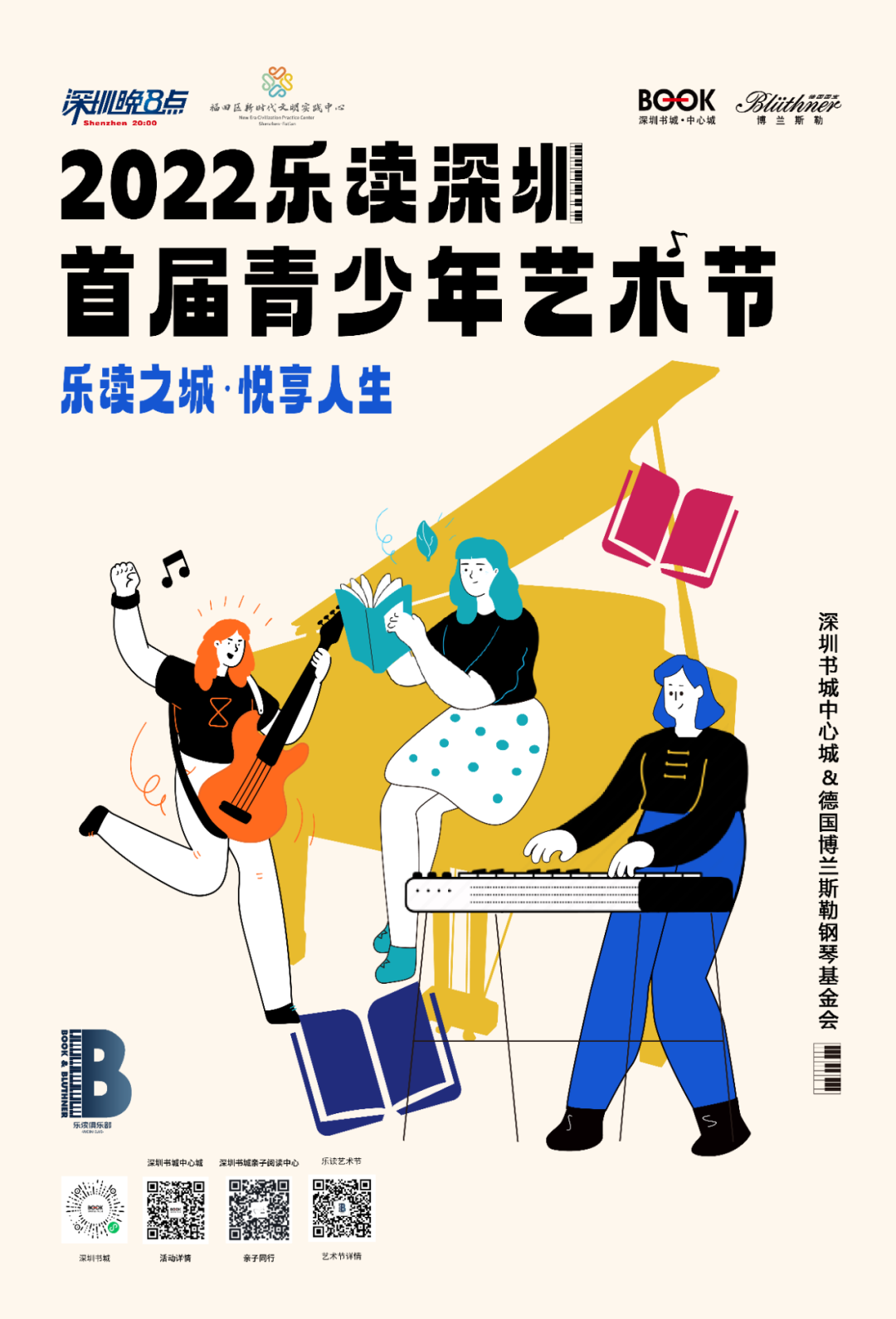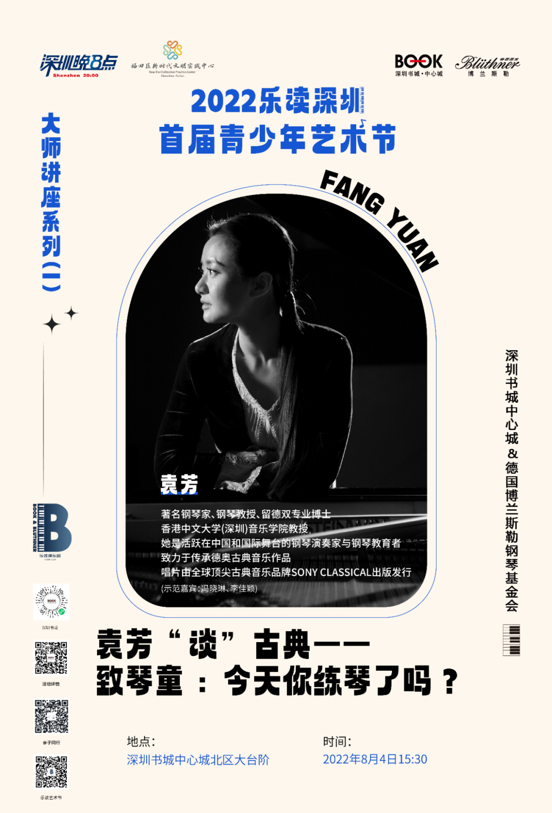 為進一步提升青少年藝術與文學素養(yǎng),深圳書城中心城與德國博蘭斯勒鋼琴基金會聯(lián)合策劃推出2022樂讀深圳·首屆青少年藝術節(jié),旨在為熱愛音樂與文學的青少年提供一個音樂交流與學習的平臺,讓更多人能從音樂中獲取更多新知與靈感,用音樂傳遞美好,發(fā)現(xiàn)日常生活中的藝術之美與文學之美。本次藝術節(jié)是一項全國性質的青少年藝術人才選拔活動,通過豐富的音樂藝術活動與選拔比賽挖掘各器樂優(yōu)秀人才,展現(xiàn)世界風采。2022樂讀深圳·首屆青少年藝術節(jié)將于8月底正式啟動?;顒娱_始前,我們將舉辦四場主題音樂講座進行預熱,特別邀請到音樂界大咖為現(xiàn)場觀眾提供專業(yè)講解與藝術分享,讓市民在音樂與文學中感受美與力量。