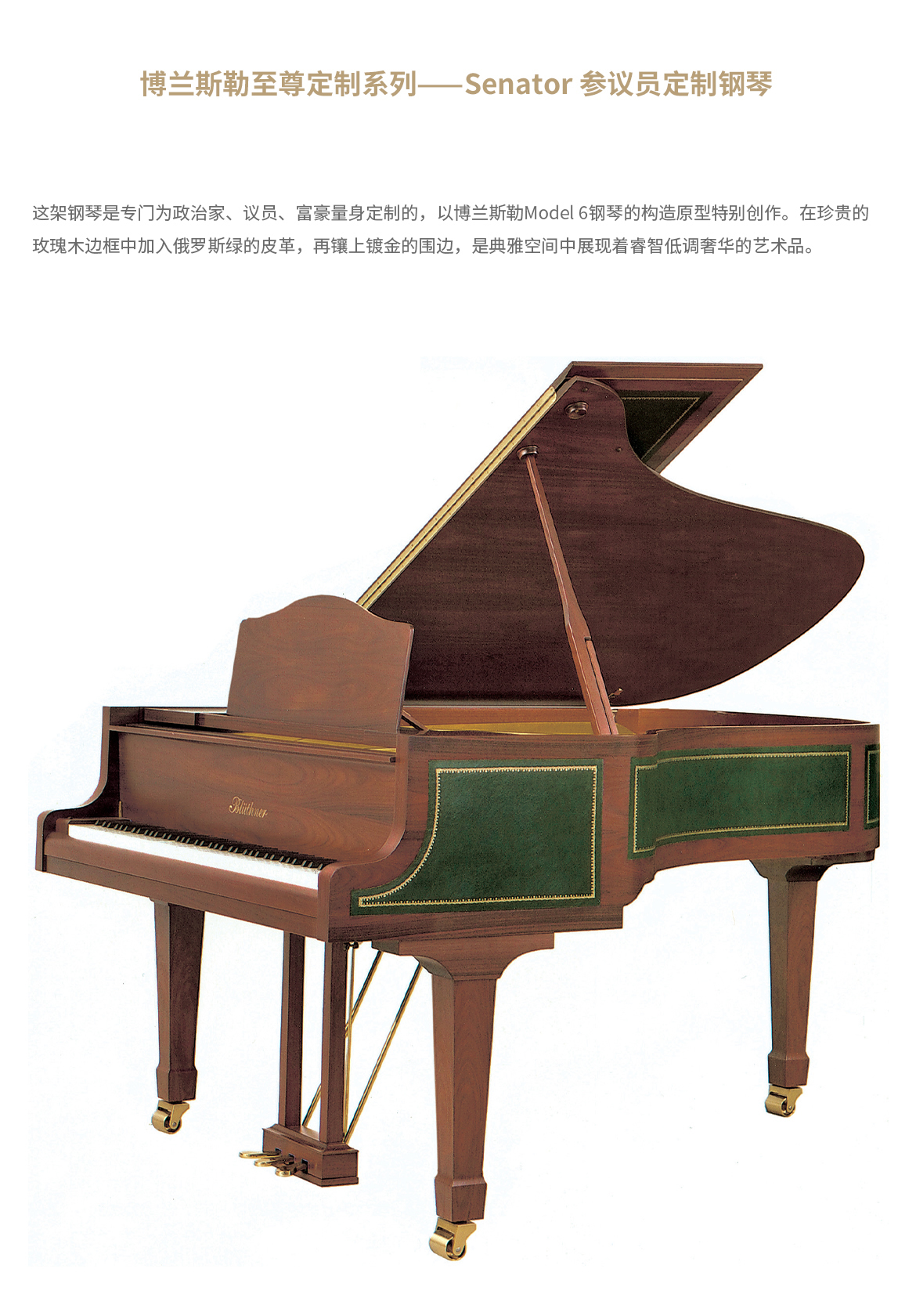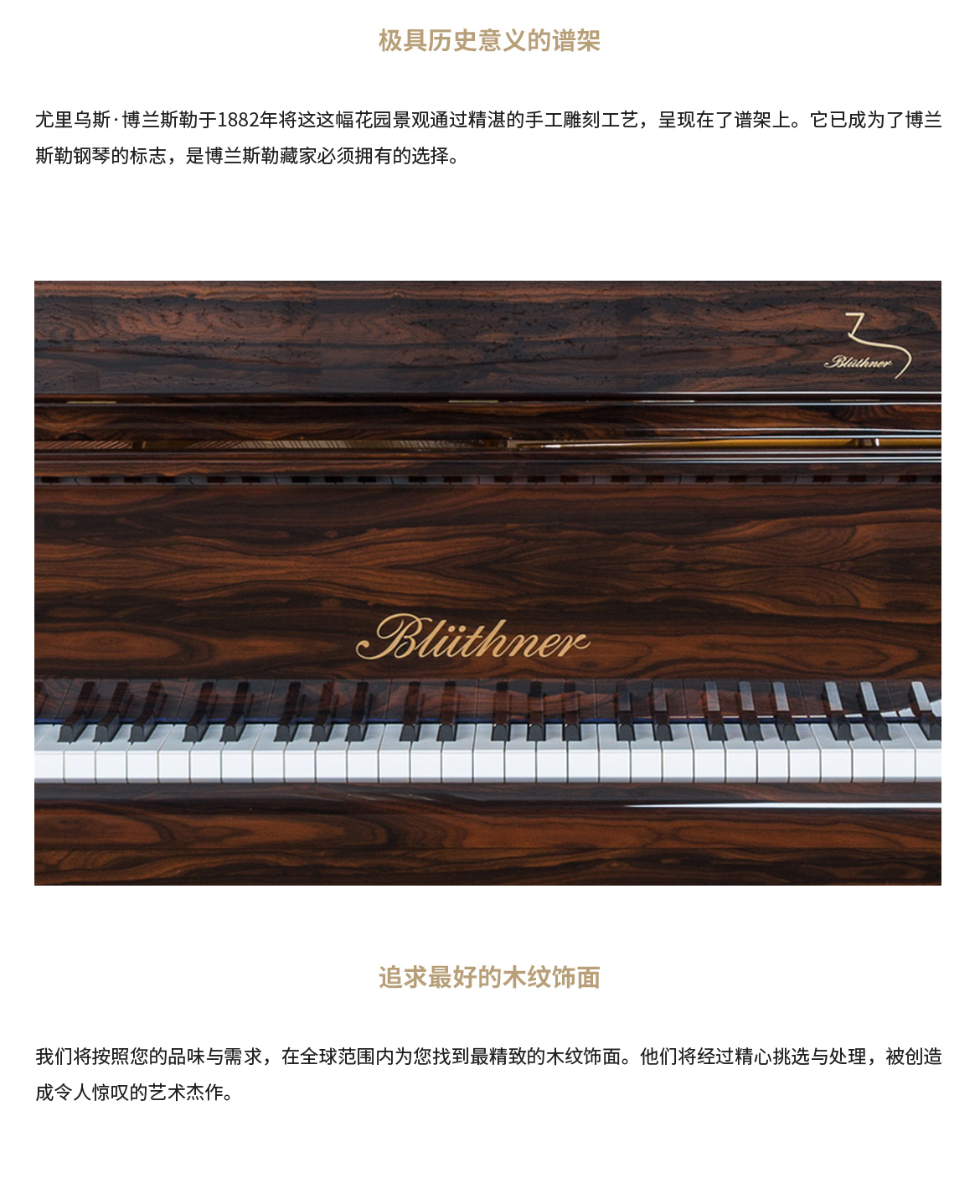 所有博蘭斯勒三角鋼琴(Model11除外)均配備博蘭斯勒專利Aliquot弦列系統(tǒng)。在鋼琴最高音區(qū),每個(gè)琴鍵配有四根琴弦,其中一根額外琴弦略高于其他琴弦且不受琴槌擊打。這根共鳴弦會與演奏的音符產(chǎn)生同振共鳴,從而增強(qiáng)音效,營造出豐富、溫暖且多彩的音色。該體系由尤利烏斯·博蘭斯勒于一個(gè)半世紀(jì)前研發(fā),被視為"博蘭斯勒黃金音色"的核心要素。